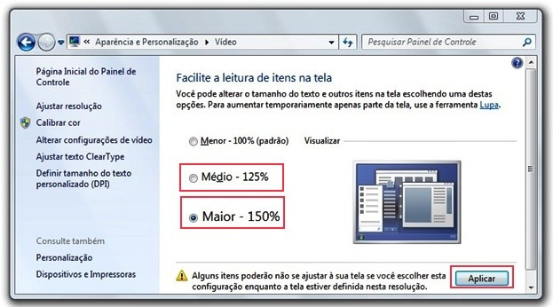 No entanto, em alguns monitores de alta resolução, principalmente em notebooks ao ajustar a resolução máxima da tela as letras acabam ficando muito pequenas atrapalhando o uso do equipamento então o Windows das linhas Vista até 10 sugerem que seja feita um ajuste ampliando, e é aí aonde ocorre o problema.