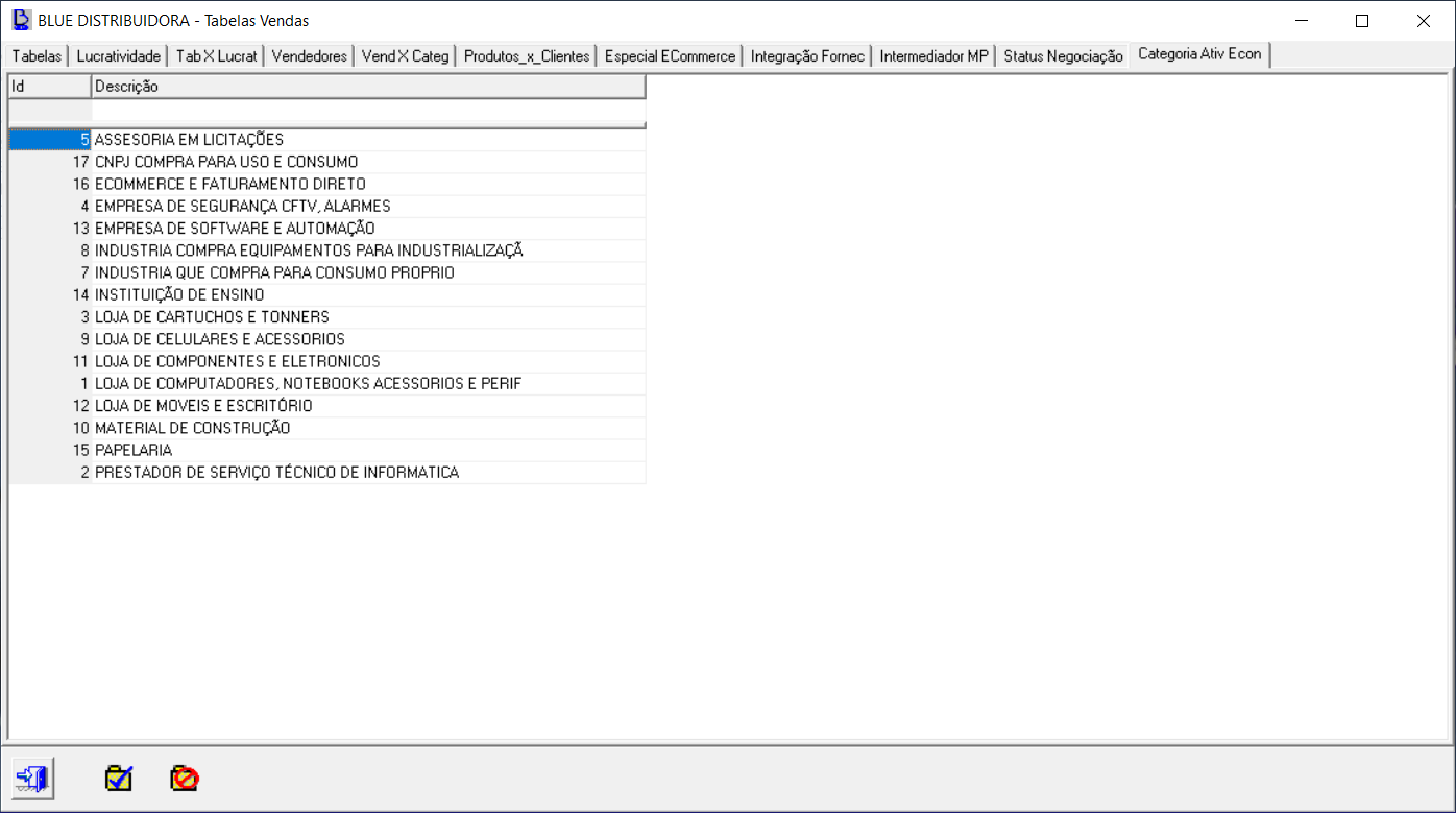 Primeiro deve-se criar a lista de atividades desejada para classificar em Manutenção -> Tabelas -> Vendas na aba "Categoria Ativ Econ" lançando para incluir na linha acima do grid apenas a descrição da atividade. O id é gerado automaticamente e não pode ser alterado.