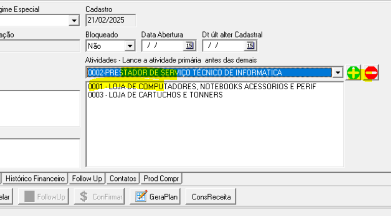 O segundo passo é classificar cada cliente na tela de cadastro de clientes, na aba Limite e crédito selecionando e adicionando (botão mais ( + ) verde) em primeiro lugar a atividade principal do cliente que será a primeira. Para excluir clique na lista e clique no botão menos ( - ) em vermelho